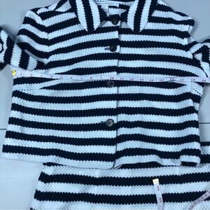 Jacket: Size 14. Features a structured design with a striped pattern and an all-over diamond weave texture. The jacket includes a classic collar, adding a touch of sophistication.