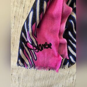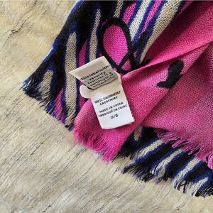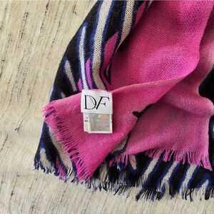 This elegant scarf from Diane Von Furstenberg features a striking combination of pink, black, blue, and white hues, perfect for adding a touch of sophistication to any ensemble. Crafted with attention to detail, it offers a versatile accessory option for both casual and formal occasions. The luxurious 100% cashmere fabric ensures warmth and style, making it a must-have addition to your accessory collection. There is a small area with a snag on the fabric...not too noticeable and definitely concealed when the scarf is wrapped.