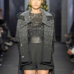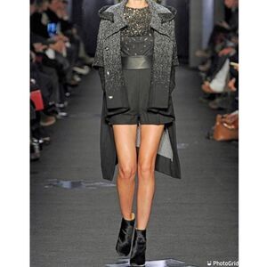 Pleated detail on the front with side slit pockets and exposed fully functional side zip closures. Mixed media.