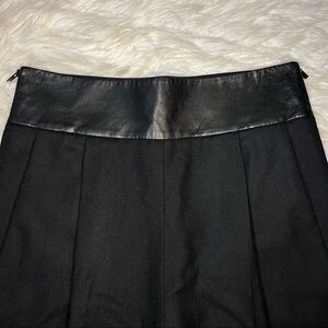 Shell: 34% polyester 33% vicose 32% wool 1% elastane Combo: (Waist area) 100% Leather Lining: 97% cotton 3% spandex