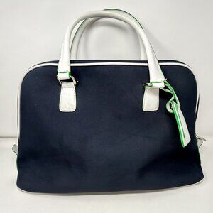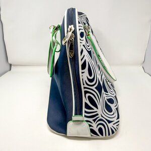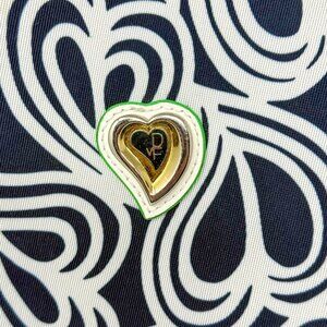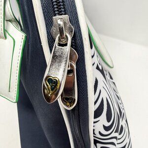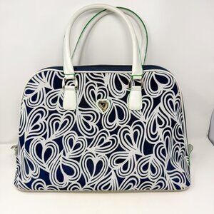Not your average travel bag. This DVF weekender is a rare find from the Badanco-distributed accessory line—featuring DVF’s signature swirl heart print in deep navy and crisp white, trimmed with white handles and green accent stitching. The interior? A lush green lining that pops like a secret garden. Dual enamel heart zipper pulls in green and black seal the deal.
