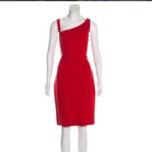 Vintage DVF fitted knit dress has an asymmetric neckline and ruching on the sides. Knee Length. Empire waistline. Knit fabric is 71% viscose, 23% polyamide, and 6% elastane. Flattering fit. Red.