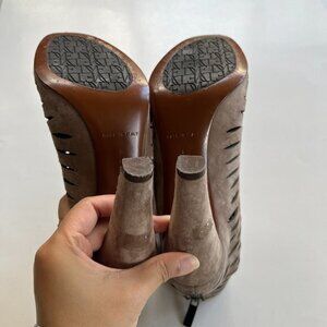 Sexy Diane von Furstenberg ‘Alexandria’ booties with laser cut perforated design, luxurious pebble-colored suede, and open toe comfort. Excellent preowned condition with little signs on the heel from tag removal. Made in Italy, retailed for $495.
