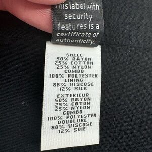 Shell: 50% rayon / 25% cotton / 25% nylon; Lining: 88% viscose / 12% silk.