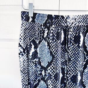 Unlined silk tapered pants in a blue snake/python print. Drawstring. Pockets.
