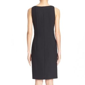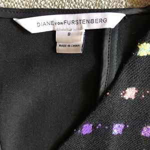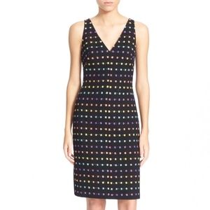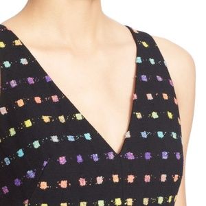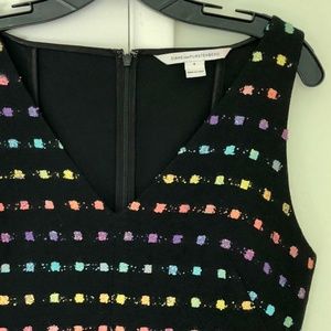 A grid of bright, mottled squares splash cheerful color over the front of a curve-skimming sleeveless dress tailored with a deep V-neckline and knee-grazing length for a fun, feminine look. Embroidered detail front, black back. This dress is gently worn, once or twice to work. It is in excellent condition. A wardrobe gem!