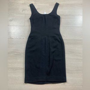 Fitted wool blend tank dress in black. Scoopneck. Hidden side zip closure. Tonal side panels with ruched detail at waist.