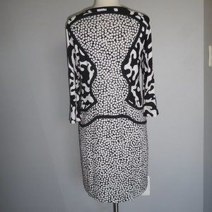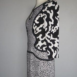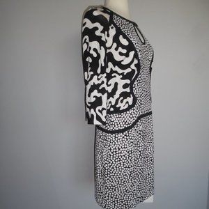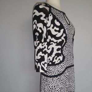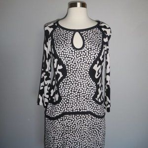 Classic stretch 3/4 length black and white print dress with key hole front. Pair with a bright heel for a pop of color