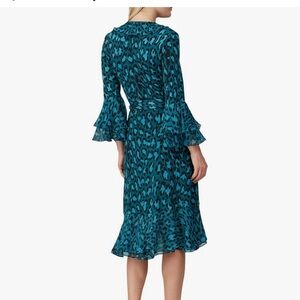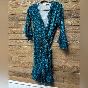 Gorgeous Diane von Furstenberg “Carli” dress in a bold blue and black animal print. Features a flattering wrap silhouette, ruffled trim, and tiered bell sleeves. This pre-loved piece was originally available through Rent the Runway and still has plenty of life left. Perfect for events, date nights, or dressing up your everyday look.