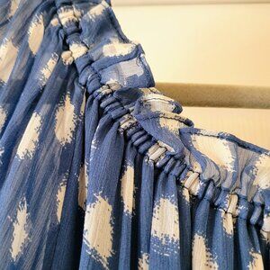 This romantic blue and white silk dress features a soft, off-the-shoulder neckline and airy sleeves that create an effortless silhouette. Its lightweight, silk fabric drapes beautifully, cinching gently at the waist before flowing into a high-low hem that adds graceful movement with every step. Perfect for warm-weather occasions, the dress pairs sophistication with ease, making it an ideal choice for outdoor events, coastal getaways, or daytime celebrations.