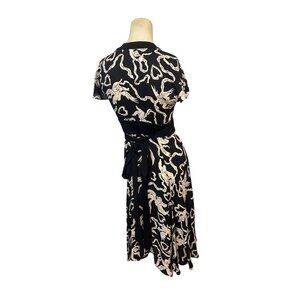 DvF vintage wrap dress in black and cream with a cupid design, pure silk, the trimmings and the wrap belt are from wool, closes with a self covered button on the neck, Very good condition, Barely worn.