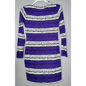 Diane von Furstenberg DVF Reina Arrow Bands Purple Tunic Dress. Long sleeves, split V-neckline, mini length. Feels like a jersey material, fitted silhouette, pullover styling.