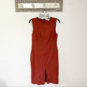 Cute Orange/Red midi shift dress. Has lots of stretch and can be dressed up or down. Does have a large spot on top back on neck area (pictured) otherwise in good used condition size 4.
