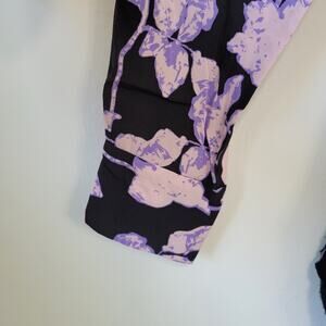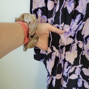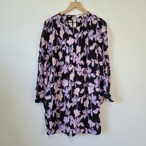 Features: Pink and black floral printed silk (100% Silk). Shift. Long sleeves. Crew neckline. Hidden back hook-and-eye closure. 36" from shoulder to hemline.