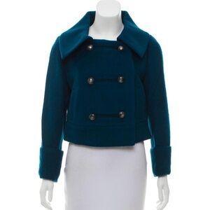 Teal Diane von Furstenberg Lady Bird wool-blend double-breasted jacket with pointed collar, dual pockets at front, satin-paneled accent at back hem and resin button closures at front. Size runs small, I wear a 4/6 and the sleeves and waist have more of a cropped look on me, but so adorable!!!