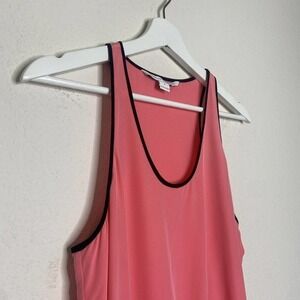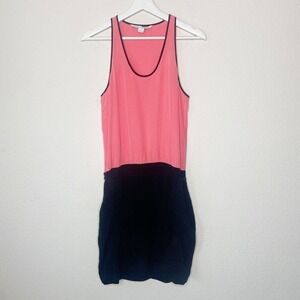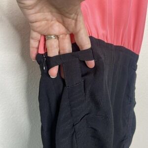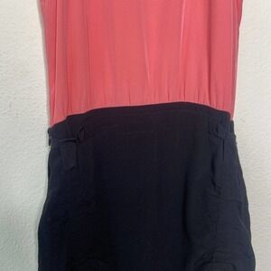 Fun dress by Diane Von Furstenberg or DVF. Shift type fit dress with a pink top and black skirt. Skirt has ruching on sides with straps. Side zip and double snap closure. Lined. Very unique and versatile! All measurements are approximate, taken flat and closed.