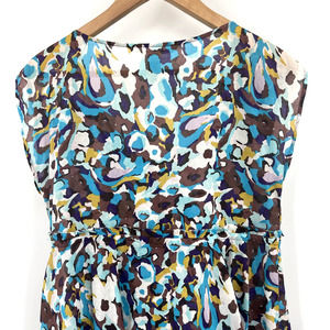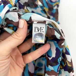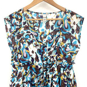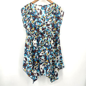 Diane von Furstenberg Marina Dress, Size Small, Swim Cover Up, Tunic, Turquoise Navy Blue White Brown Gold Mauve Colors, Ruffle Detail at Waist, Scoop Neck, Button Front, Sleeveless/Cap Sleeves, Tie Waist, Handkerchief Hemline, Trapeze Hemline, Abstract Animal Print, Swirl Print, Abstract Floral Print, Semi Sheer