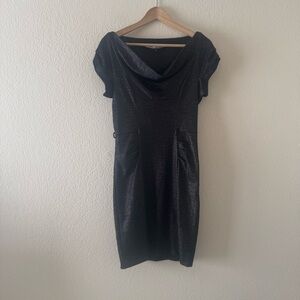 Thick fabric has a metallic sheen with some stretch and a side zipper. Cap sleeves have pleating at the top. Sheath style with cowl neckline and ruching at hips. Fabric contents: 44% viscose, 25% wool, 16% polyester, 15% polyaimide.