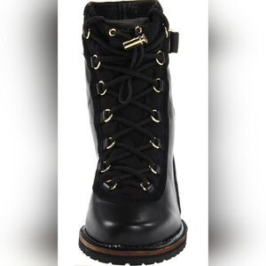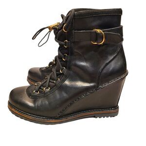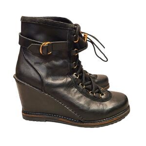 Diane von Furstenberg Senna Black Vacchetta Hidden Wedge Lace Up Booties | 10 | EUC | MSRP $378 | The Diane von Furstenberg Senna Black Vacchetta Hidden Wedge Lace Up Boots are black leather ankle boots with a wedge heel. They have a lace-up design | Additional materials Suede, Canvas and Nylon | Rubber sole