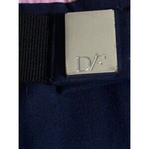 Diane von Furstenberg Delianna knee length shirt dress, size 4. Pink 100% silk blouse combo dress with navy stretch wool/viscose/lycra belted skirt. Tailored blouse features silver-tone round metal buttons with placket cover, keyhole neckline, matching snap close band collar, long classic sleeves snap cuffs, and back pleat creating a structured tucked-in appearance. Skirt attributes include side pouch pockets, wide belt loops, and removable wide black stretch elastic belt with silver-tone iconic logo snap-close buckle. Skirt center includes a front zipper that opens an 8" insert for a skort look, adding a few inches to the skirt width, or adjusting the silhouette. Button closure blouse and skirt closure by hidden side zipper with subtle pink pull tab. Timeless designer fashion creates a polished classic preppy aesthetic perfect for executive office wear and luncheon meetings. Tag Size 4 - Bust 38 Shoulder 15 Sleeve Length 23 Waist 30 Hips 38 Skirt Length18 Total Length 38 inches.