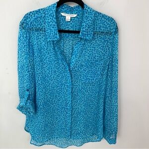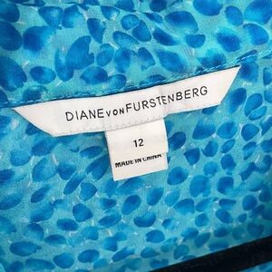 Diane von Furstenberg Silk Lorelei Roll Tab Sleeve Blouse Sz 12 Blue Spotted 22