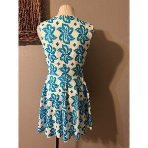 This pretty dress is from Diane von Furstenberg in a misses size 6. Blue and white in color with a nice texture. Fully lined, made of cotton. Has a smooth fit with back zipper.