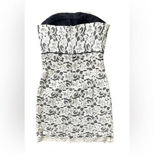 This elegant strapless dress features a beautiful white lace overlay, perfect for any special occasion. The fitted silhouette enhances your figure, offering a chic and sophisticated look.