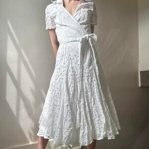 Diane von Furstenberg White Eyelet Wrap Dress 6 Cotton Collared Designer