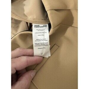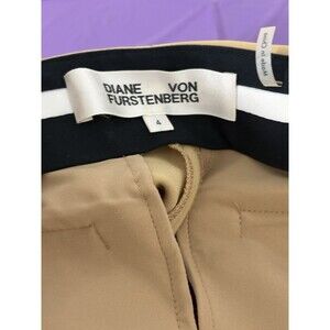 These Diane von Furstenberg women's pants are in a solid camel color and feature a high-rise, pleated front design with a straight leg style. They have a waist size of 30", Inseam of 28 3/4 inches, rise of almost 12", and a size 4 regular fit. The pants are made of Triacetate material and have a heavy weight construction, suitable for casual occasions. They come with a zip and hook-and-bar closure, with a breathable design for comfort. Perfect for adding a touch of sophistication to your everyday wardrobe.