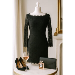 Diane von Furstenberg Zarita dress, DVF black lace dress, designer cocktail dress, made in USA DVF, classic lace sheath, holiday party dress, little black dress, scalloped lace dress, evening cocktail wear, long sleeve lace dress, DVF size 6, wedding guest