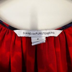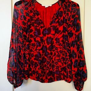 Perfect blouse for return to office. DVF blouse with elastic at the bottom so you don’t have to tuck. Works perfectly over a pair of trousers or a skirt. You can wear the neck open or closed. Lots of options for work, weekend, and girls night out. Size P.