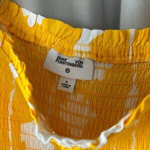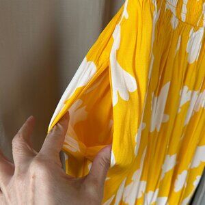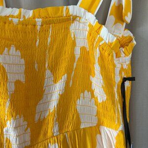 Brand new sunny maxi dress for summer! Yellow and white ginseng print fabric, perfect for the beach. Has pockets and cute tie straps. New!