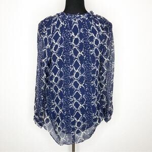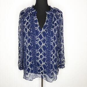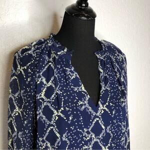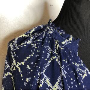 Diane Von Furstenberg navy blue yellow geometric print silk top. Pullover style with ruffle pleated collar and v neckline. Sheer overlay with full lining except sleeves. Button cuff sleeve with ruffled cuffs. Curved hemline. Size 4. Excellent preowned condition. One tiny run on back as shown. 100% silk with polyester lining.
