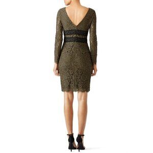 Green lace (70% Rayon, 30% Nylon). Long sleeves. V-neckline. Sheath bodice. Hidden back zipper with hook-and-eye closure. Partially lined.
