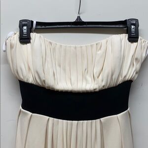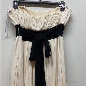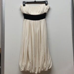 Add a touch of designer luxury to your wardrobe with this stunning cream strapless dress from Diane Von Furstenberg. With a beautiful black waist tie bow, this midi dress is perfect for any occasion, from a night out to a special event. The solid knit viscose material and fit and flare style make this dress both comfortable and elegant. The strapless neckline and sleeveless style are complemented by the accents of the bow and the ivory color. This dress is a regular size 6 and is suitable for any season, from winter to spring to summer and fall. Don't miss out on the chance to own a piece of Diane Von Furstenberg's product line and add this beautiful dress to your collection