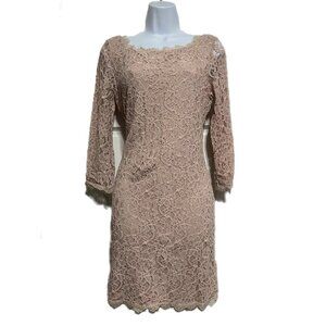 Size 10, but fits more like an 8. Fitted taupe floral lace dress with full gold zipper on the back. Sheer lace 3/4 length sleeves, with matching beige lining in the body of the dress. Great dress for weddings, semi formal, or cocktail attire events. Worn only once, very good condition.