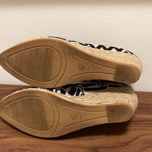 Diane B. Milano closed toe navy & black graphic print espadrille. Jute wedge heel, pointed toe and rubber sole. Fabric upper and leather lining. Made in Italy. Worn lightly. Size 7. Excellent condition. Jute covered Wedge heel 2.5 in.