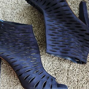 Chic navy peep-toe heels with cut-out design. Stylish and modern.