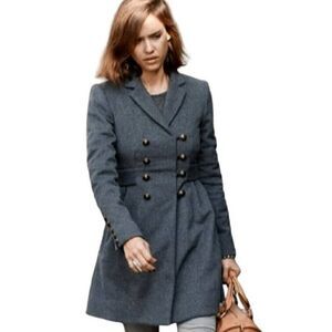 Leather details at the collar and on the elbow patches. Double breasted button details.