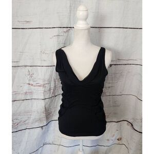 Black sleeveless top with draped silk neckline. Silk also accents the side. In very good condition.