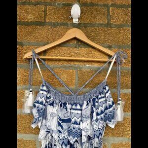 Rib waist layered Pom Pom straps length 34” inches this dress is a little heavy has some weight I good condition