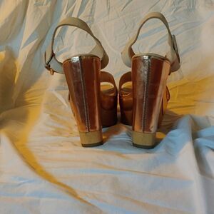 Step into spring with these wooden platform sandals, made in š§š· Brazil accented with rose patent leather,with cream leather ankle and toe straps!in excellent used condition!
