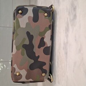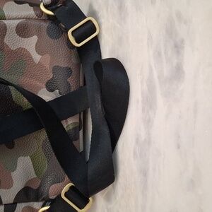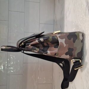 mini camouflage diaper backpack, front snap closure, front zip pocket, 2 side exterior pockets, 2 spacious interior compartments, side snaps to expand, green-brown-black colors, see pics, see details, EUC.