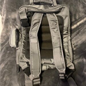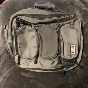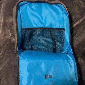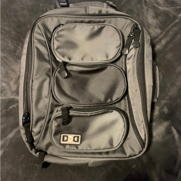 Gently used Diaper Dude backpack diaper bag. It’s grey with blue interior. Backpack has a lot of pockets for plenty of storage.