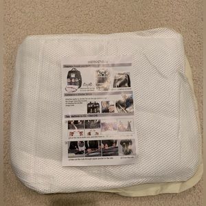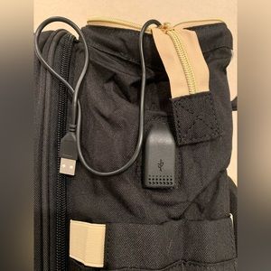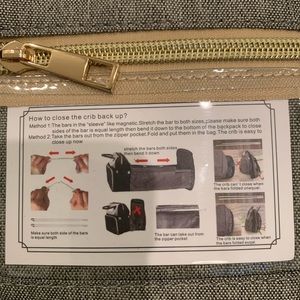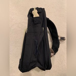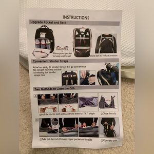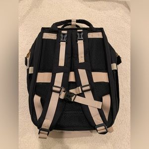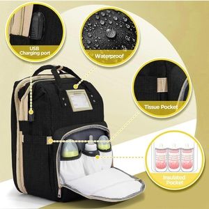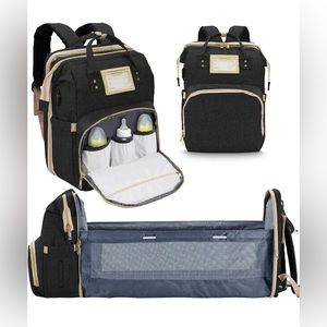 Black diaper backpack with changing pad and table area/crib in the bag.