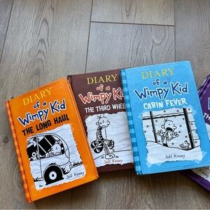 Enjoy the adventures with the Diary of a Wimpy Kid book set. Featuring vibrant purple, green, brown, and orange covers, this collection is perfect for young readers.