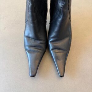Size 8. Pointy toe + zip up. Good condition with flaws pictured. Heel tips recently replaced.
