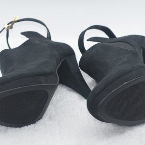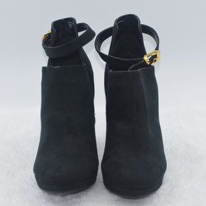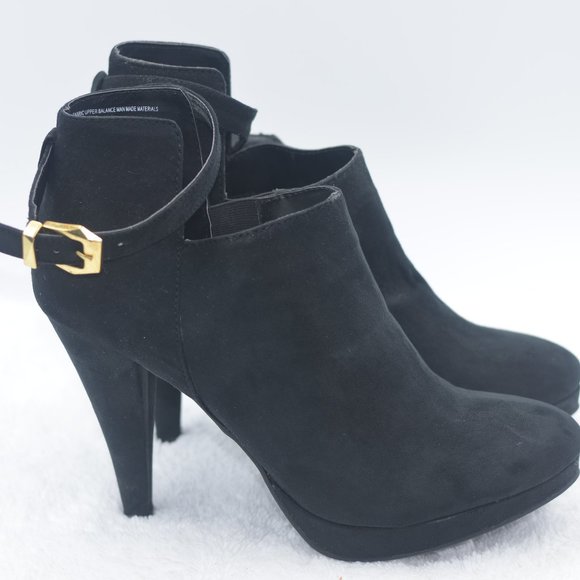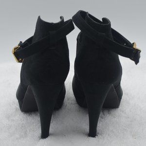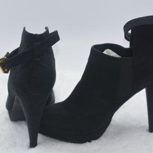 Diba Black suede platform bootie with a 2 inch platform to even out heel height. Come with a buckled ankle strap and an elastic stretch on inner side.