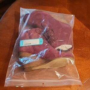 NEW Diba Blake Leather Suede Bootie Ankle Lace Up & Zip Up Wedge Heeled Boots, Burgundy with Brown Heels in New with tags condition but without the box. Sizes available are 6.5 & 7. I only have 1 pair of each size in stock so buy these gorgeous boots quickly before another savvy buyer gets them!