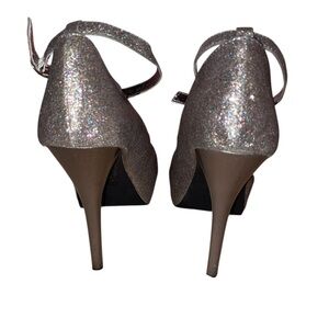 These diba east “Nella” platform stilettos are really beautiful. They feature adjustable ankle straps, a padded footbed, a 5.5” heel, 2” platform, and glitter that is smooth and will not flake off.